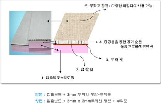 부직포로 마무리한 마감재 접합면은 벽지, 페인트, 황토몰탈 등 모든 건축용 마감재를 자유롭게 시공할 수 있다.